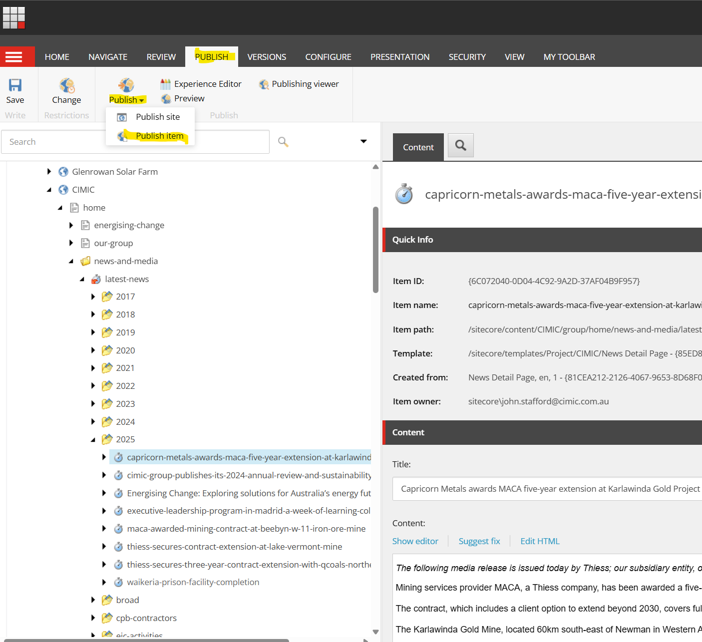 The Content Hub's integration with Sitecore XMCloud streamlines the News/Media Releases process. This integration centralizes most content development steps within the Content Hub, while Sitecore XMCloud is exclusively used for publishing(although content can still be edited after the sync from Content Hub). This guide will walk you through the process of publishing content after synchronization from the Content Hub.